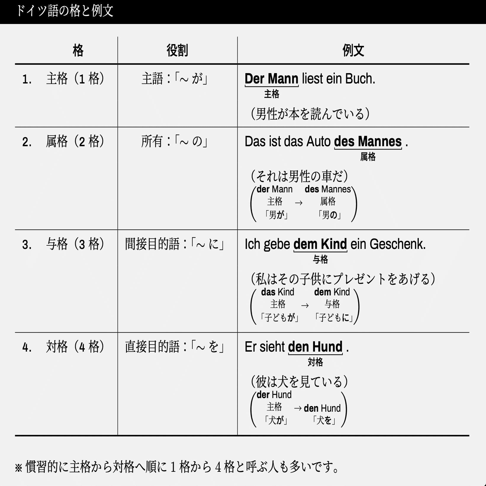 格により、定・不定冠詞、形容詞の語尾が変化するため、とても重要です。